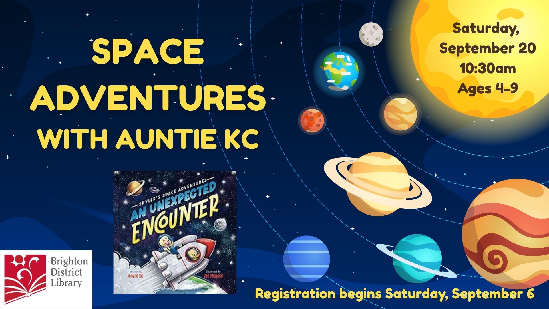 Join Auntie KC (AKA Dr. Kathryn Clark, former NASA Chief Scientist, and author of Skyler’s Space Adventures) as she reads from her book and answers questions about NASA and space! We’ll also make our own straw rockets. Her books are geared towards ages 4-9, but all ages are welcome. Registration begins Saturday, September 6.